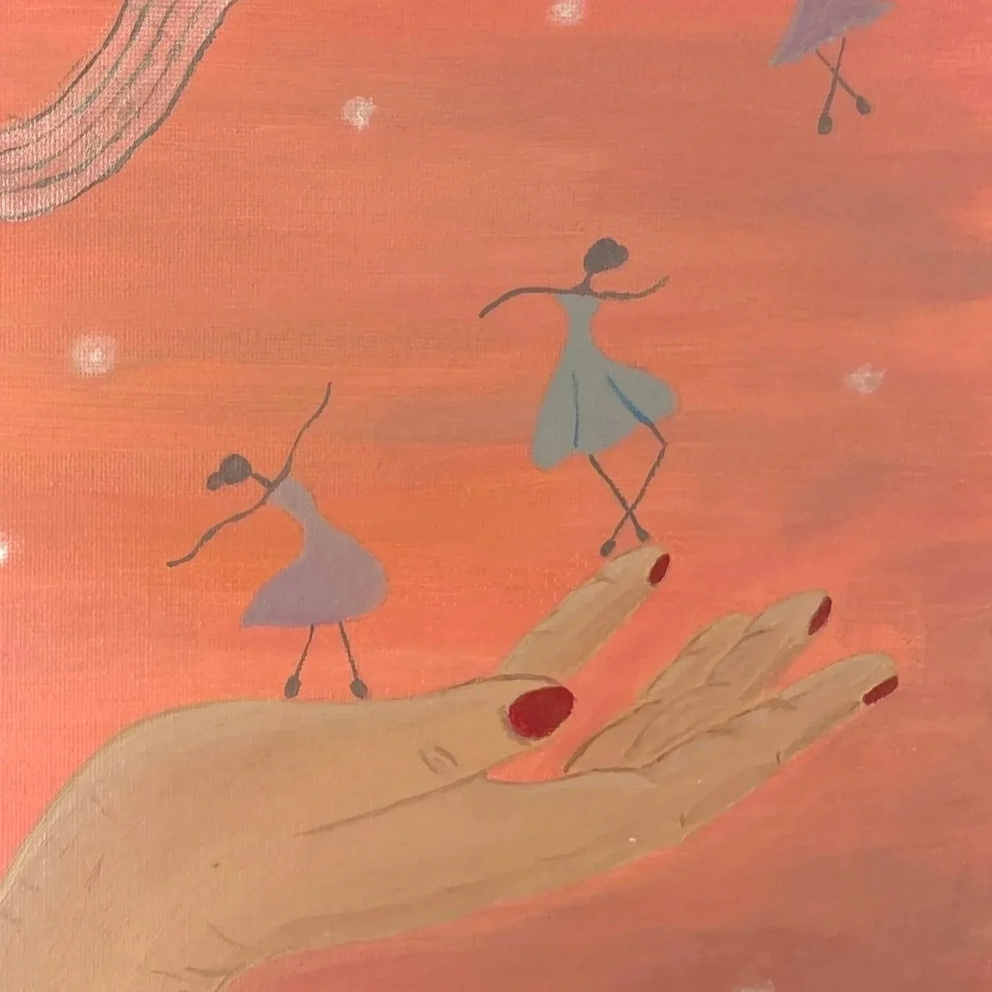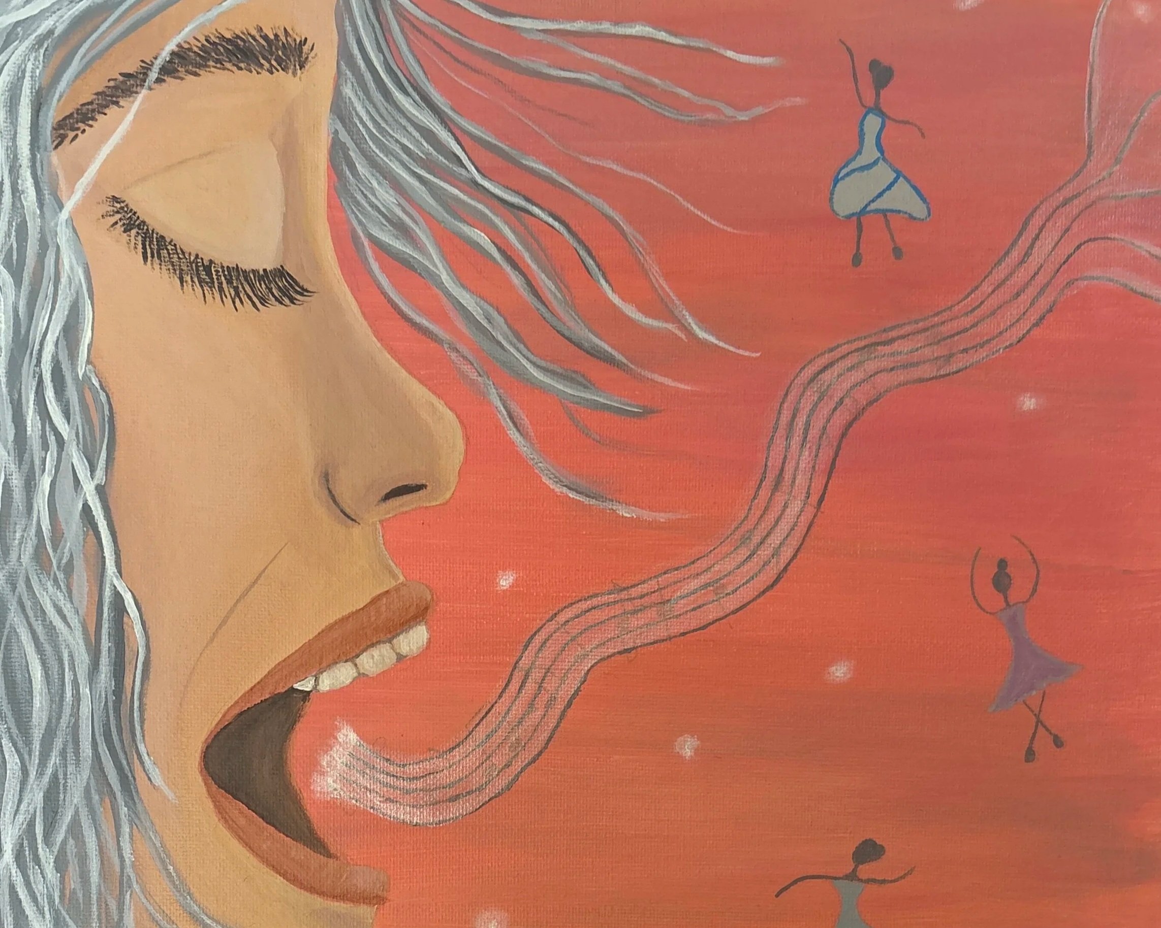 Die dargestellte Figur ist nach innen gerichtet, während sich Notenlinien aus ihr heraus entwickeln. Tanzende Figuren erscheinen als fragile Formen innerer Gedanken und Empfindungen. Sie wirken leicht und flüchtig und verweisen auf eine Bewegung, die nicht greifbar, aber spürbar bleibt.