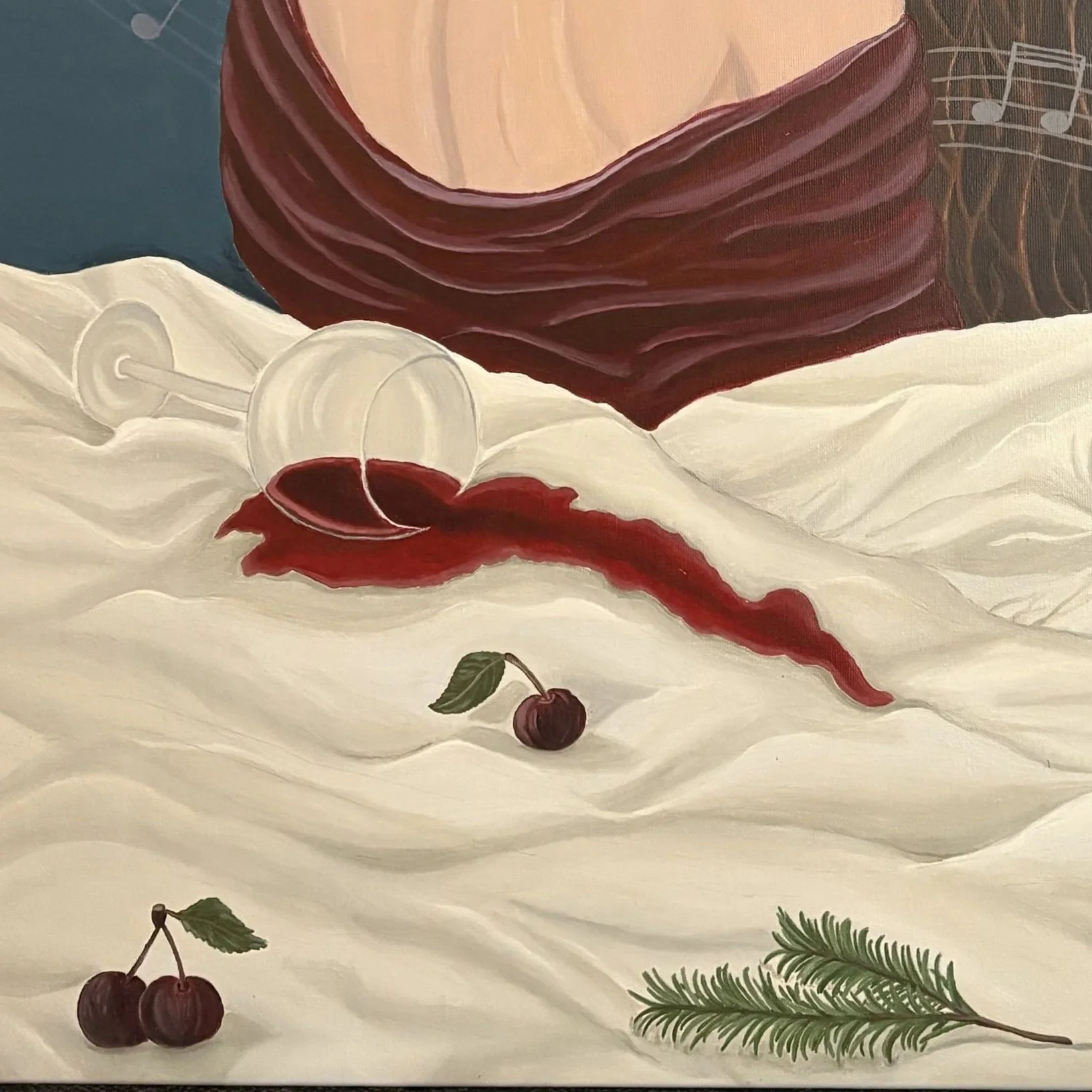 Die dargestellte Figur befindet sich in einem Zustand der Ruhe. Ihr gesenkter Blick verweist auf ein nach innen gerichtetes Wahrnehmen. Der verschüttete Wein und die Kirschen stehen für emotionale Überschreitung, Sehnsucht und Erinnerung. Der gesprungene Spiegel deutet einen leisen inneren Wandel an.