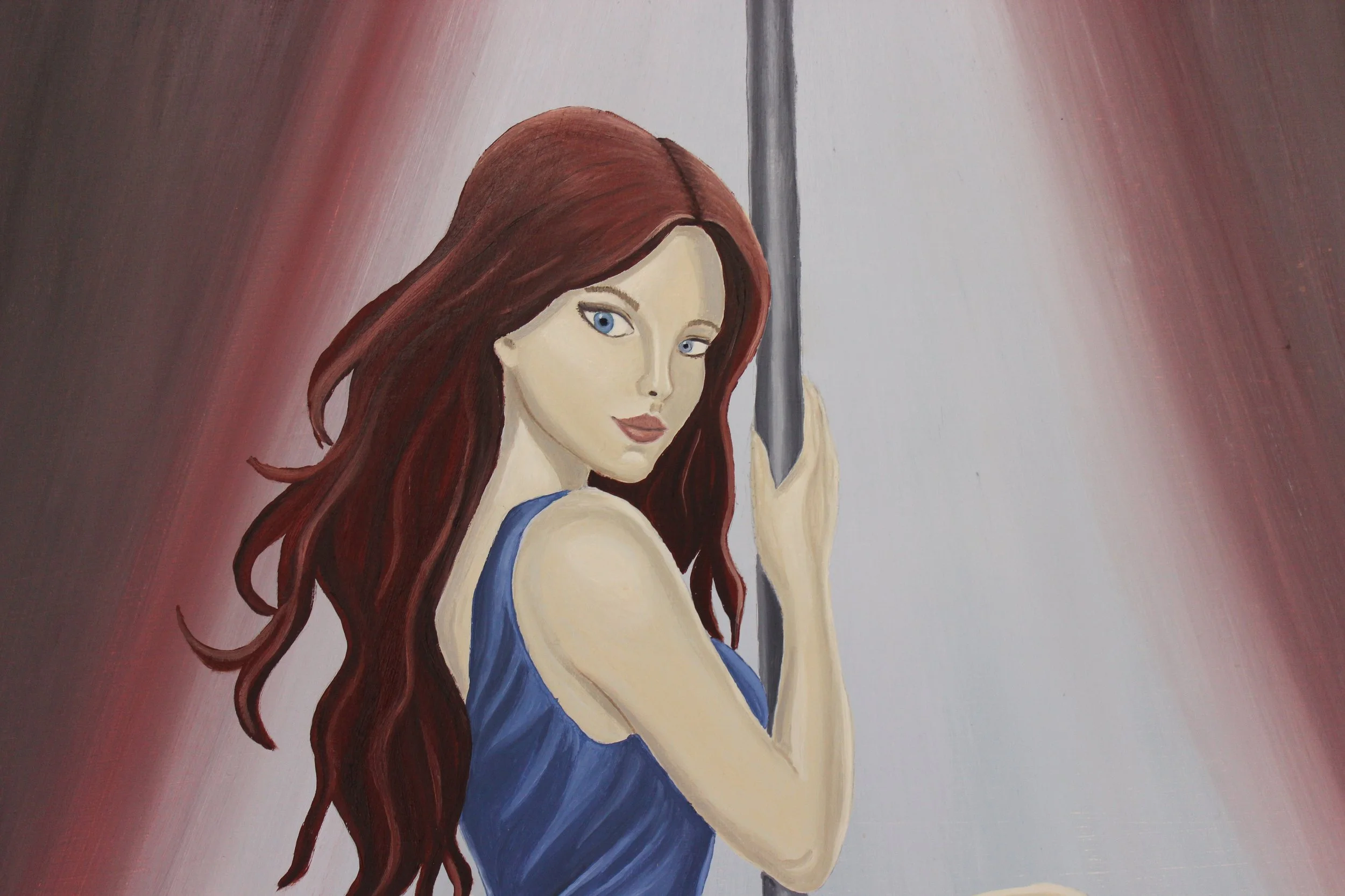 Die dargestellte Figur befindet sich auf einer Bühne im Lichtkegel. Ihre Körperhaltung wirkt kontrolliert und souverän, zugleich bleibt ihr Blick entzogen. Die vertikale Stange steht für Halt, Disziplin und Abgrenzung. Sie markiert eine innere Struktur, die Nähe ermöglicht, aber nicht zulässt.