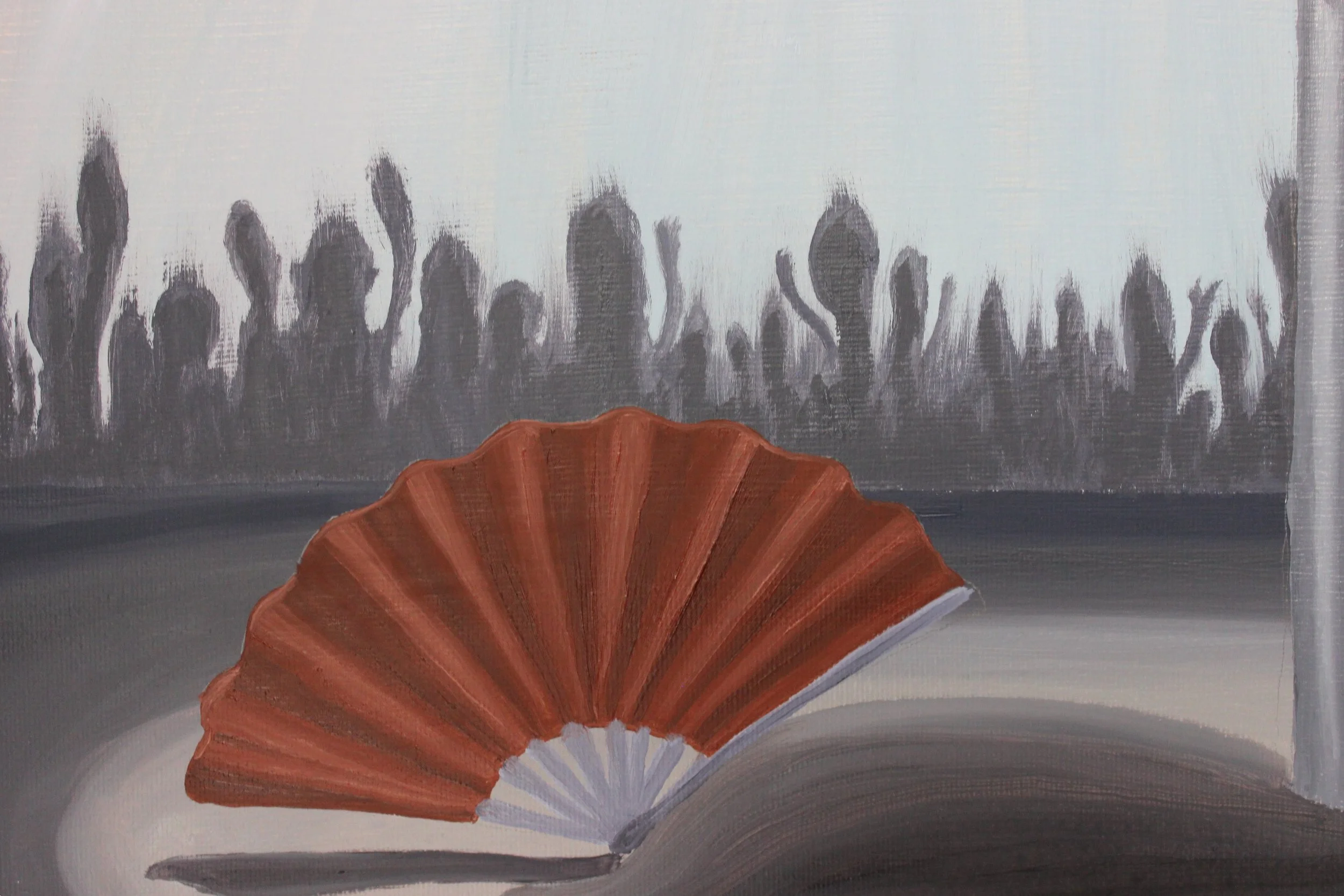 Der abgelegte Fächer und die Spinnweben verweisen auf vergangene Rollen, Erwartungen und Projektionen. Sie liegen am Rand des Geschehens und wirken wie Relikte früherer Inszenierungen. Der reduzierte Raum verstärkt die Konzentration auf Haltung und Präsenz der Figur.